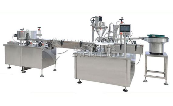粉劑灌裝封口機(jī)生產(chǎn)線是星火公司針對一些瓶裝粉劑產(chǎn)品的一款新型灌裝生產(chǎn)線,該灌裝生產(chǎn)線主要由震動式理瓶機(jī)、自動定位灌裝壓蓋機(jī)、鋁箔封口機(jī),圓瓶貼標(biāo)機(jī)組成,它是一款自動化非常高的全自動粉劑灌裝封口生產(chǎn)線。該粉劑灌裝封口機(jī)生產(chǎn)線常用于醫(yī)藥粉劑、獸藥粉、殺蟲劑粉、魚藥粉、花蟲粉、調(diào)料粉、人參粉、三七粉、靈芝孢子粉等多款粉劑產(chǎn)品的灌裝。該粉劑灌裝封口機(jī)生產(chǎn)線自動化程度高,灌裝速度快,是醫(yī)藥、食品、獸藥等行業(yè)的小瓶粉劑分裝必備的全自動粉劑灌裝封口生產(chǎn)線,目前該粉劑灌裝生產(chǎn)線已經(jīng)在多家企業(yè)中使用,生產(chǎn)效率非常高,備受廣大廠家的喜歡。